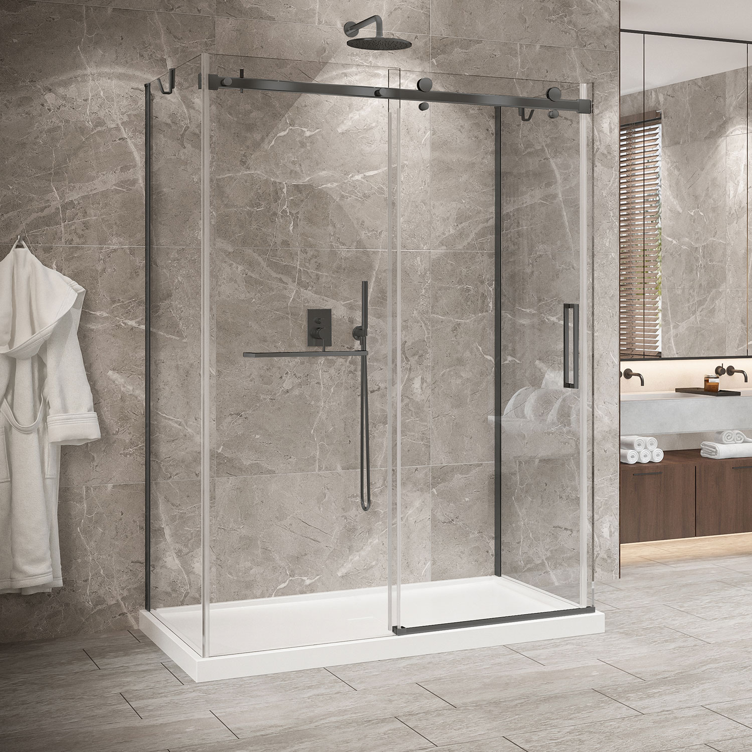 Shower door Bellini 2.0, installation on wall, 60" x 36", towel bar and hook included, sliding door, gunmetal frame and clear glass, Zitta collection