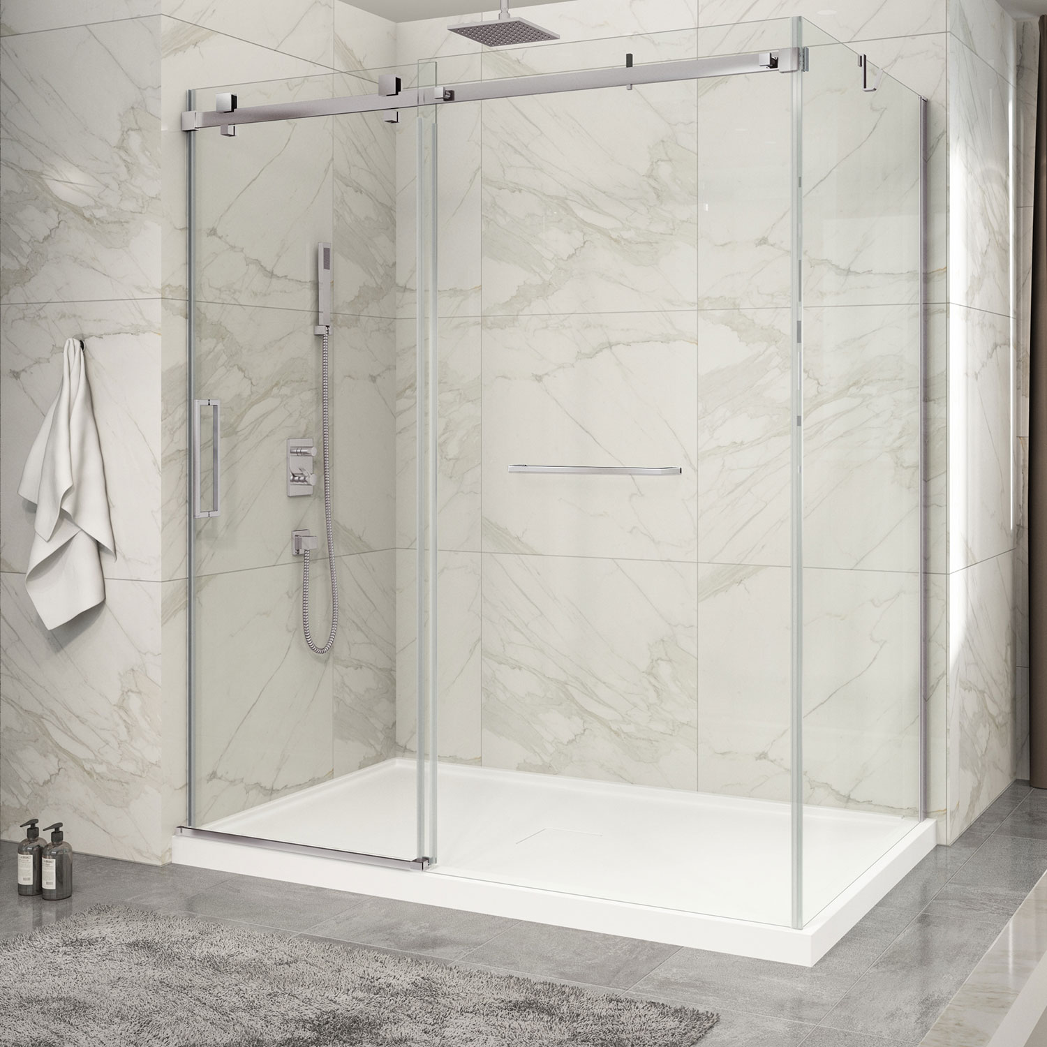 Zitta shower base not available in this dimension. Shower door Piazza 2.0 in a corner closing on wall, wall on the left, door on the left, 72" x 42", towel bar and hook included, sliding door, brushed nickel frame and clear glass, Zitta collection