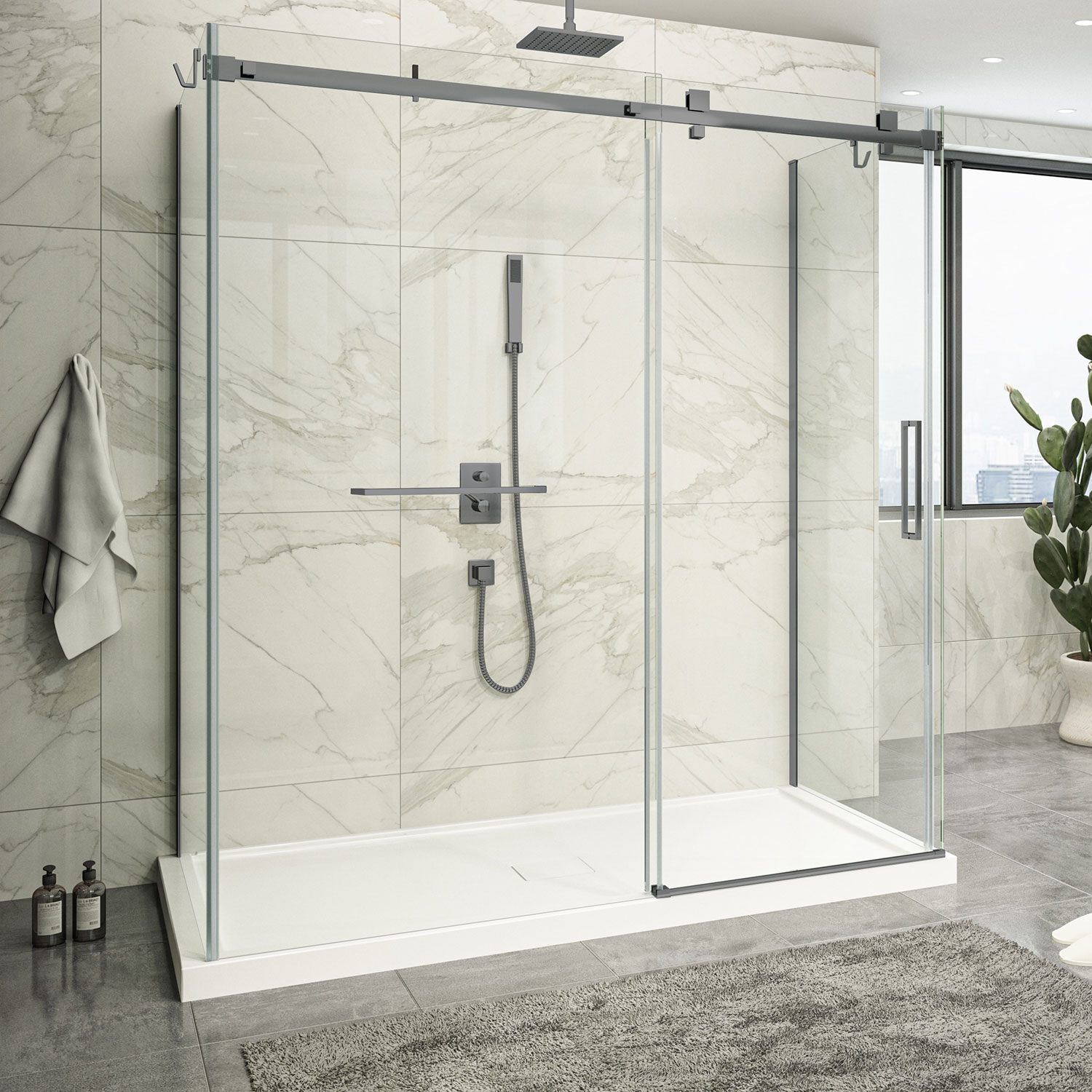 Zitta shower base not available in this dimension. Shower door Piazza 2.0, installation on wall, 72" x 42", towel bar and hook included, sliding door, gunmetal frame and clear glass, Zitta collection
