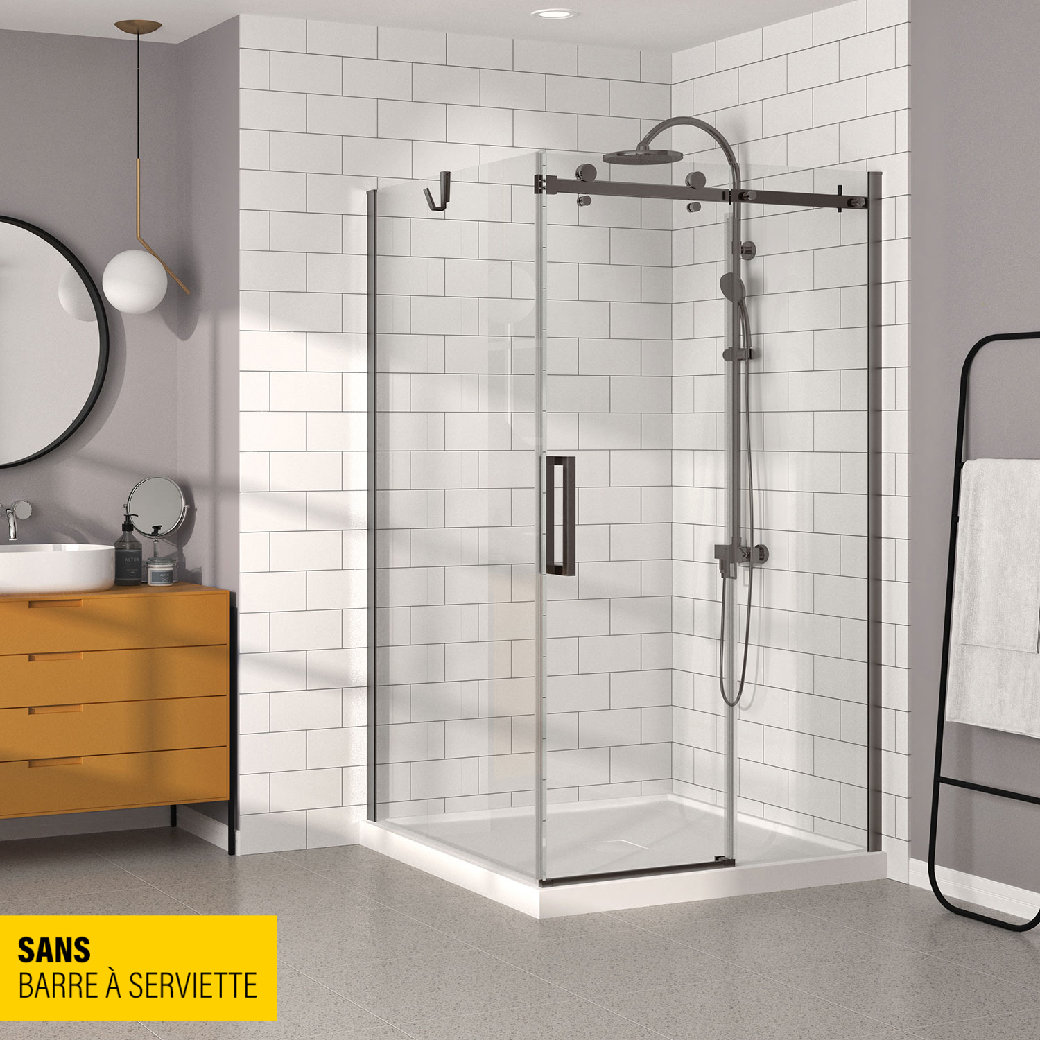Porte de douche Bellini, en coin fermeture sur retour, mur à droite, porte à gauche, 48" x 42", barre à serviette non incluse, porte coulissante, cadre gunmétal et verre clair, collection Zitta