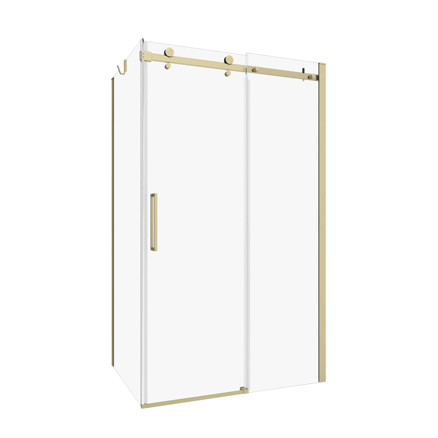 Porte de douche Bellini, en coin fermeture sur retour, mur à droite, porte à gauche, 48" x 42", barre à serviette non incluse, porte coulissante, cadre or brossé et verre clair, collection Zitta