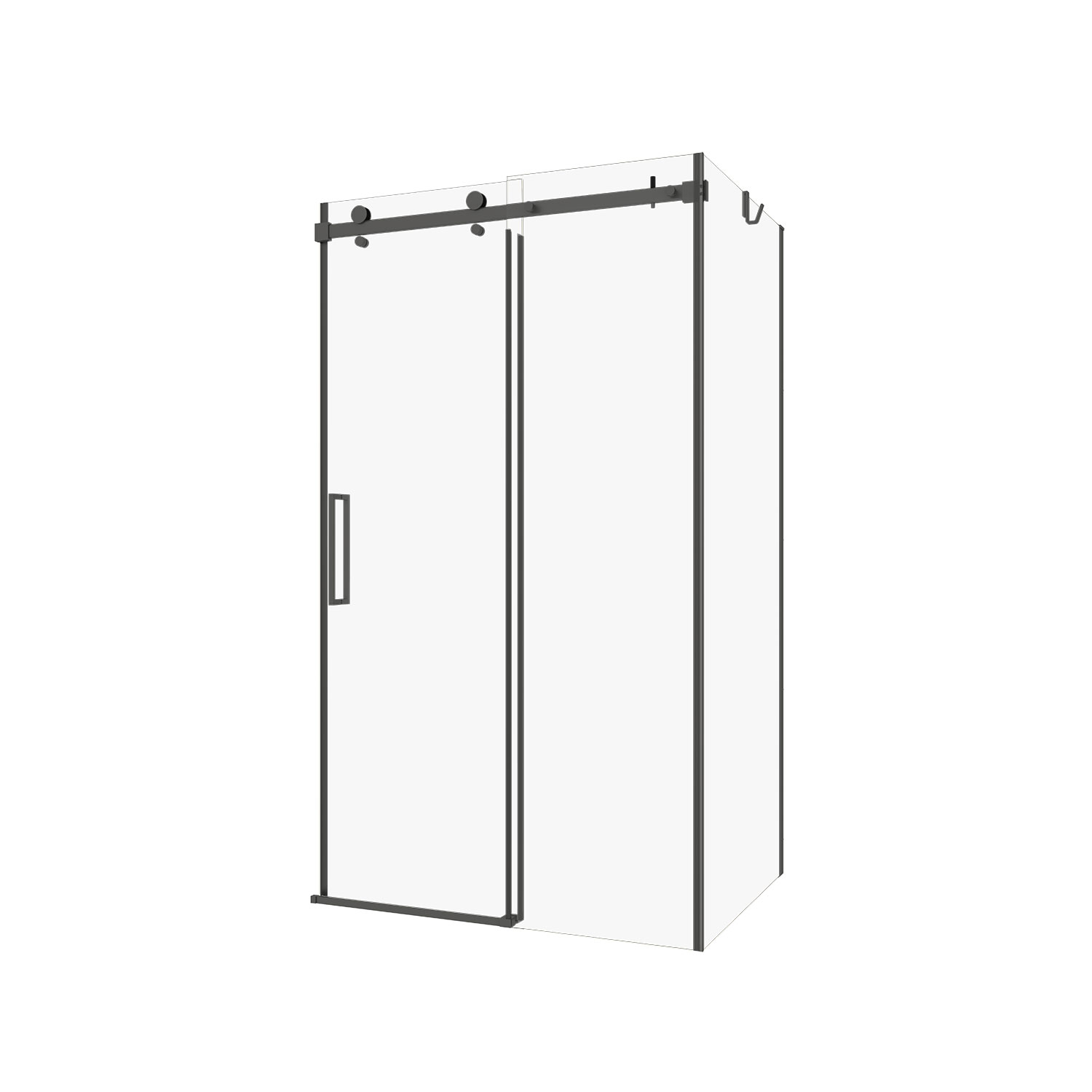Porte de douche Bellini, en coin fermeture sur mur, mur à gauche, porte à gauche, 60" x 42", barre à serviette non incluse, porte coulissante, cadre noir mat et verre clair, collection Zitta