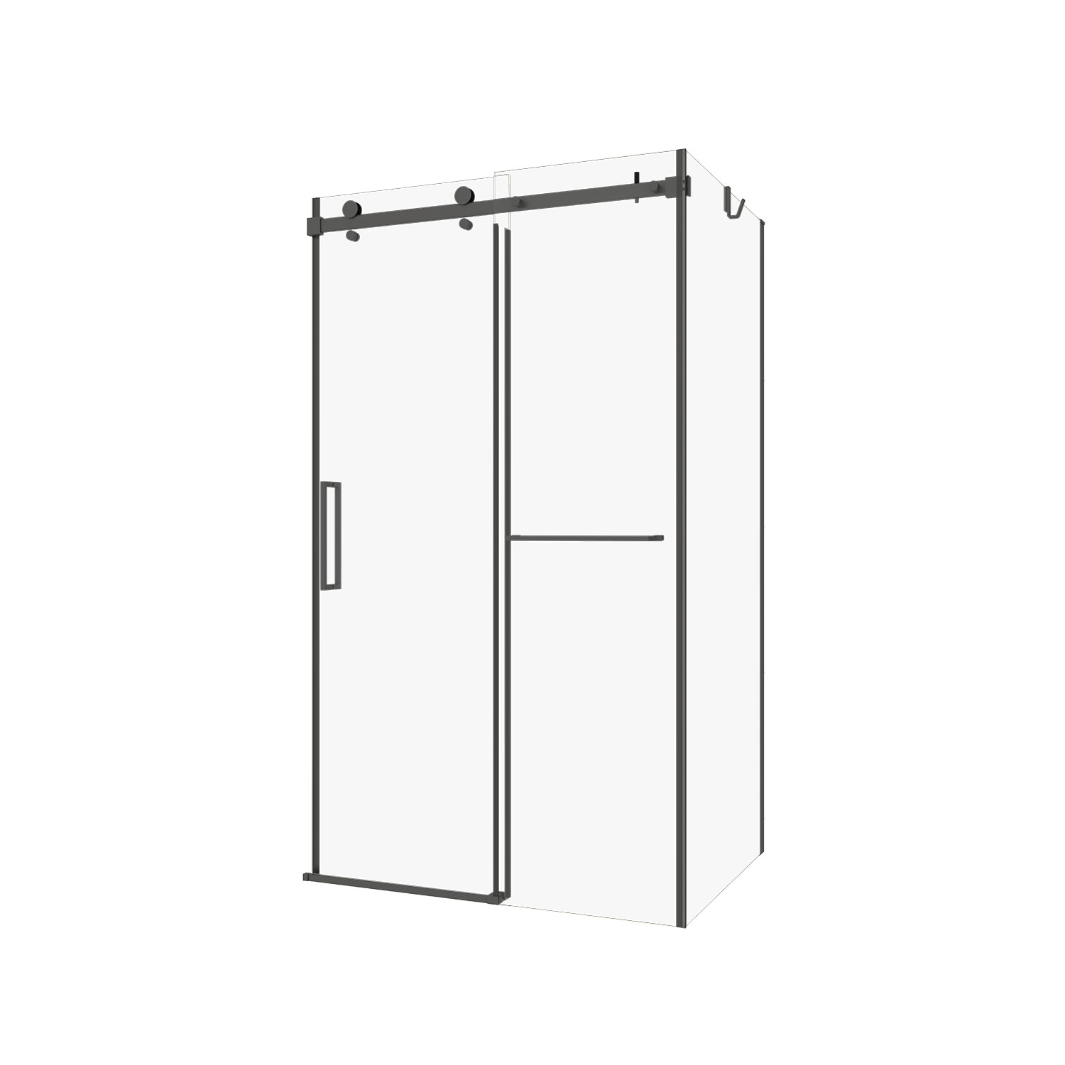 Porte de douche Bellini 2.0, en coin fermeture sur mur, mur à gauche, porte à gauche, 48" x 32", barre à serviette et crochet inclus, porte coulissante, cadre noir mat et verre clair, collection Zitta