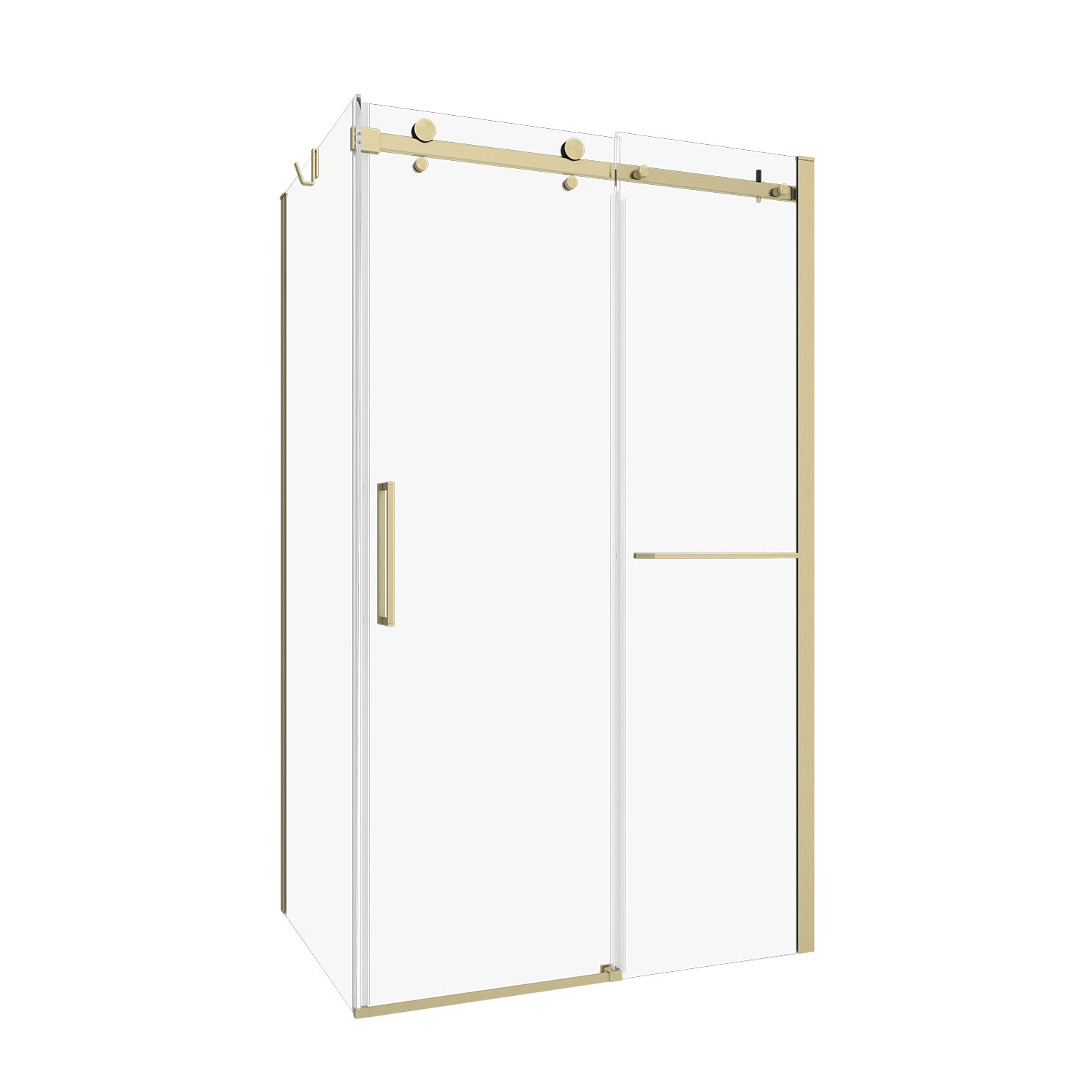 Porte de douche Bellini 2.0, en coin fermeture sur retour, mur à droite, porte à gauche, 54" x 36", barre à serviette et crochet inclus, porte coulissante, cadre or brossé et verre clair, collection Zitta
