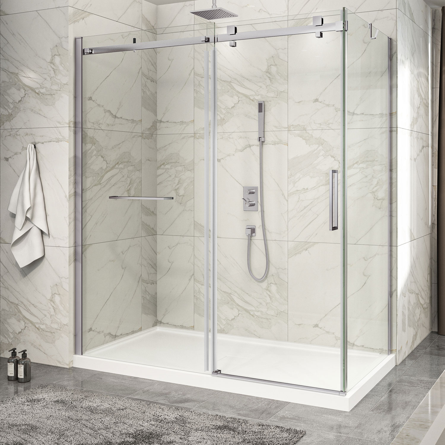 Base de douche Zitta non disponible dans cette dimension. Porte de douche Piazza 2.0, en coin fermeture sur retour, mur à gauche, porte à droite, 72" x 32", barre à serviette et crochet inclus, porte coulissante, cadre nickel brossé et verre clair, collection Zitta